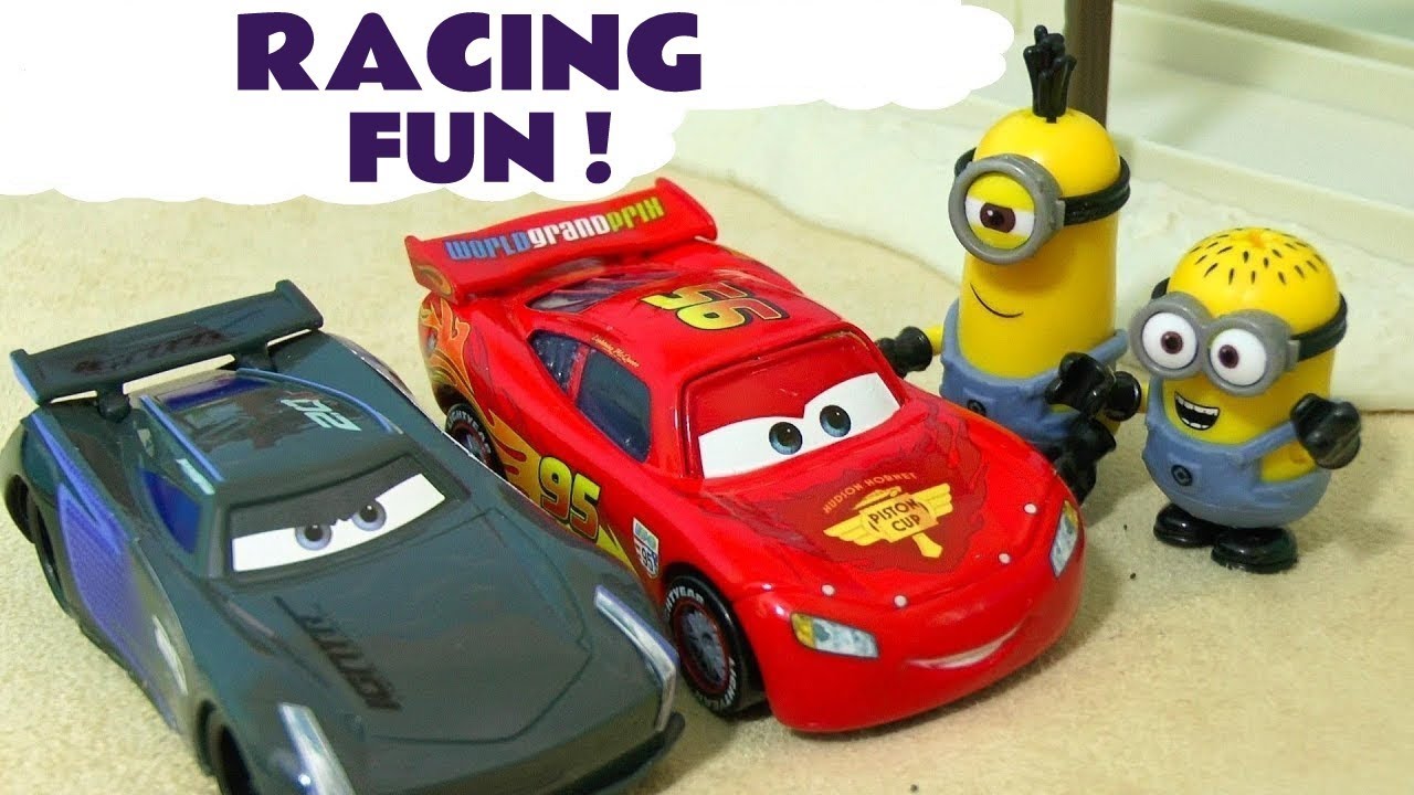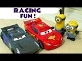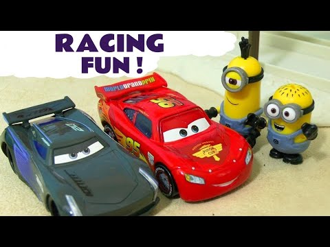 Minions Cars 3 Race Off McQueen vs Storm - Funny toy story with Hulk Spiderman Hot Wheels TT4U ─ ToyTrains4u