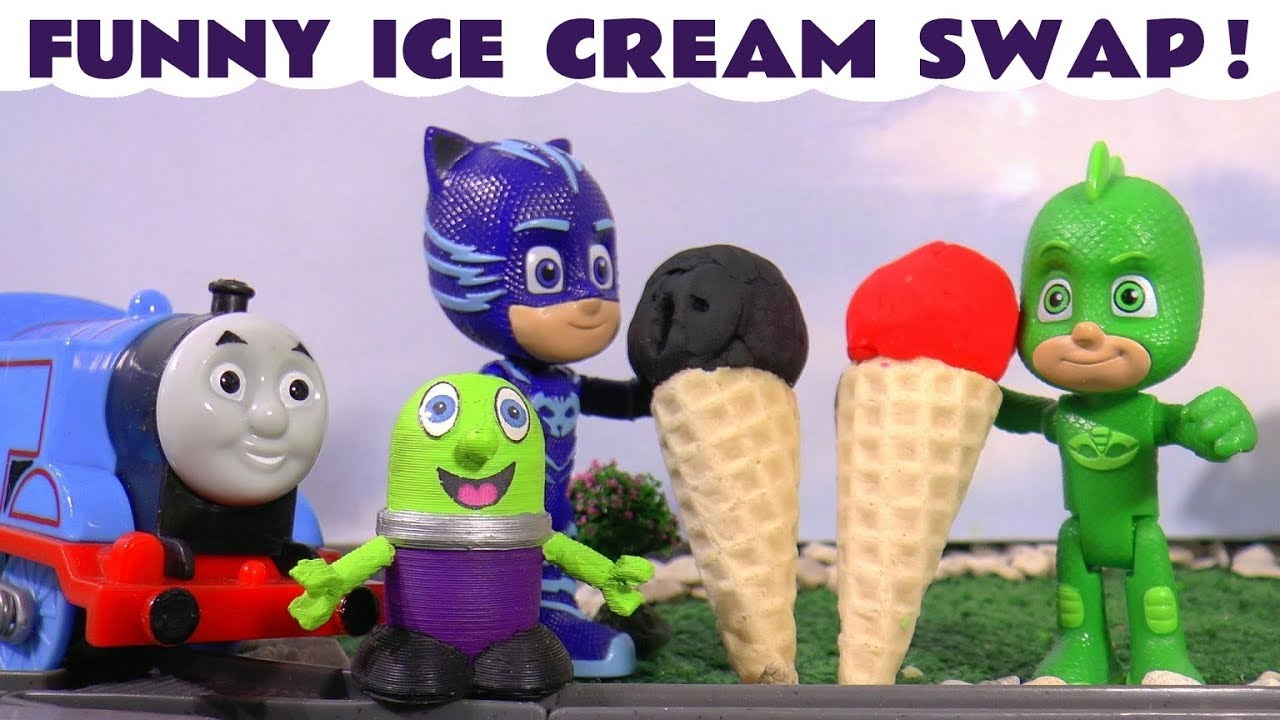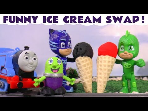 Thomas The Tank Engine and funny Funlings Play Doh Ice Cream swap with PJ Masks and Tom Moss TT4U ─ Toy Trains 4u