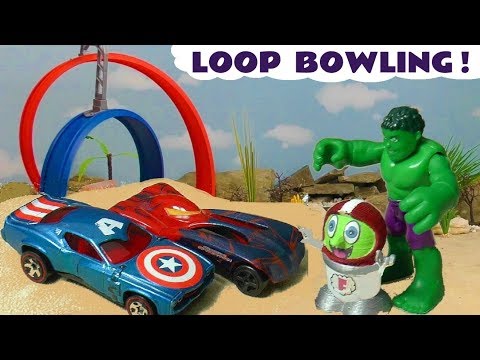 Hot Wheels Superhero cars loop bowling with Avengers Hulk Spiderman and the funny Funlings TT4U ─ Toy Trains 4u