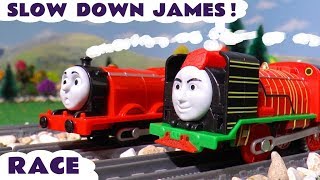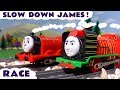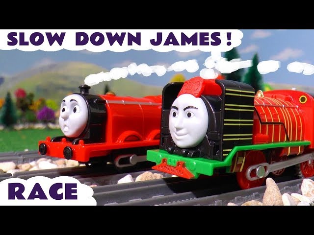 Thomas & Friends Episode with James racing Big World Big Adventures Yong Bao toy train. James thinks he's the fastest red engine and to prove it he races Yong Bao but before that he didn't get his brakes fixed when they started making funny noises. An accident looks likely in this fun toy train story for kids and children.